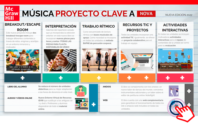 - Proyecto integral que permite acceso al contenido desde cualquier lugar a través del material interactivo online: audiovisuales, audiciones, prácticas, actividades TIC e información extra que ayudarán a los estudiantes a entender los aspectos básicos de cada unidad.